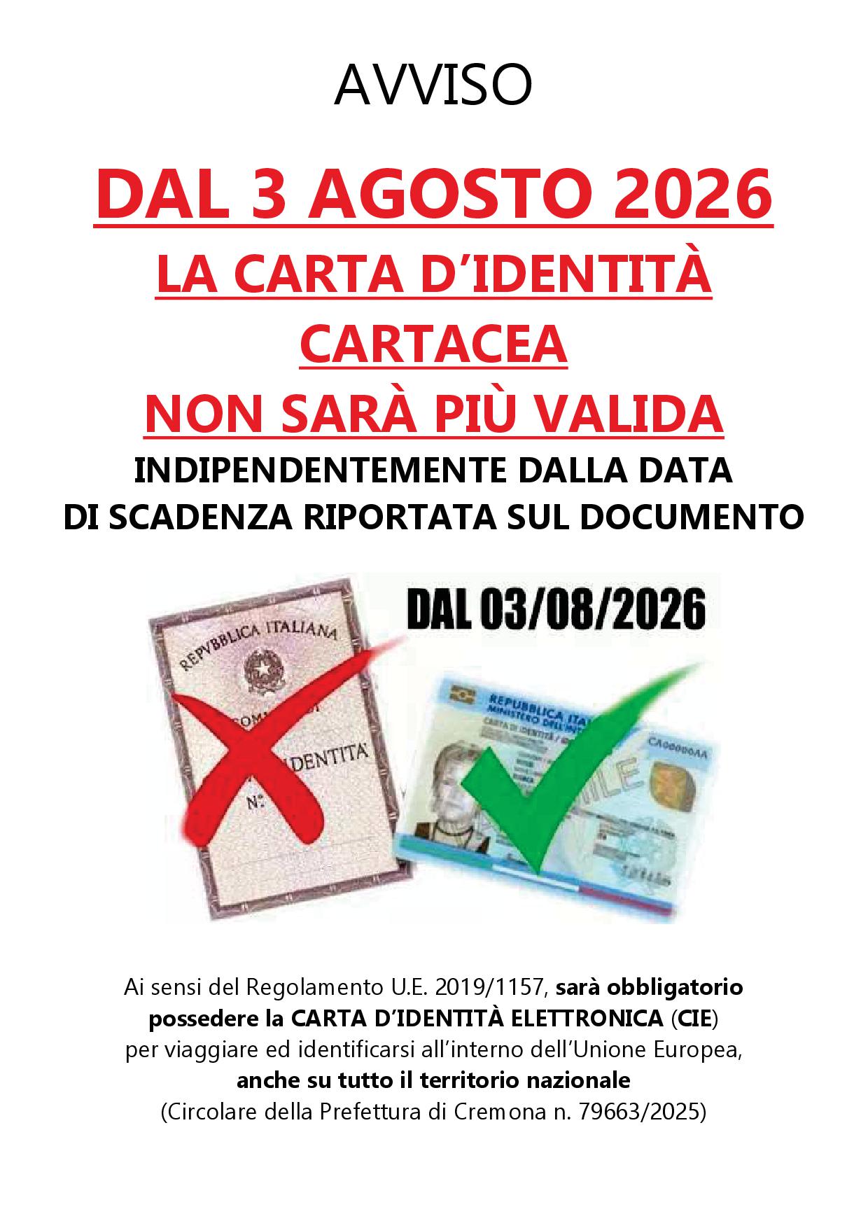 DAL 03/08/2026 LE CARTE D’IDENTITÀ CARTACEE NON SARANNO PIÙ VALIDE. A PRESCINDERE DALLA DATA DI SCADENZA RIPORTATA SUL DOCUMENTO, DIVENTERANNO, QUINDI, INUTILIZZABILI.